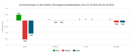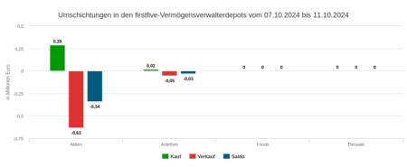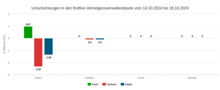 In der 44ten Woche belief sich das Verkaufsvolumen in unserem Depotausschnitt auf 2,07 Mio. Euro, die sich auf Aktien (1,73 Mio. Euro), Fonds (0,23 Mio.) und Anleihen (0,11 Mio.) verteilten.