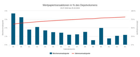 In der 44ten Woche belief sich das Verkaufsvolumen in unserem Depotausschnitt auf 2,07 Mio. Euro, die sich auf Aktien (1,73 Mio. Euro), Fonds (0,23 Mio.) und Anleihen (0,11 Mio.) verteilten.