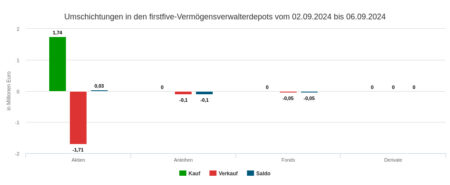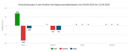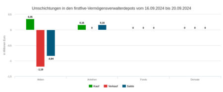 Der Verkaufsumsatz in Woche 39 in Höhe von 3,27 Mio. Euro verteilte sich auf Aktien im Wert von 0,58 Mio. Euro und Anleihen mit einem Volumen von 2,70 Mio. Euro.