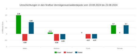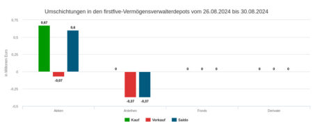 Die Assets under Management in unserem Depotausschnitt für die Handelswoche Nr. 36 summierten sich auf 302,31 Mio. Euro. Das ist relativ zu sonst ein sehr großer Ausschnitt, was seine Repräsentativität in Bezug auf die Grundgesamtheit aller Depots, die firstfive beobachtet, erhöhen sollte. Allerdings setzten die damit erfassten Vermögensverwaltungen nur 1,19 Prozent dieses Volumens in der Berichtswoche mit ihrem Handel um – das ist die Umsatzquote.