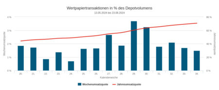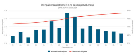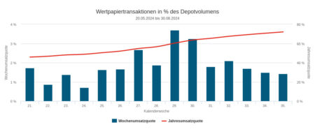 Die Assets under Management in unserem Depotausschnitt für die Handelswoche Nr. 36 summierten sich auf 302,31 Mio. Euro. Das ist relativ zu sonst ein sehr großer Ausschnitt, was seine Repräsentativität in Bezug auf die Grundgesamtheit aller Depots, die firstfive beobachtet, erhöhen sollte. Allerdings setzten die damit erfassten Vermögensverwaltungen nur 1,19 Prozent dieses Volumens in der Berichtswoche mit ihrem Handel um – das ist die Umsatzquote.