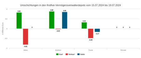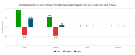 Die per Depotausschnitt für die 31. Woche berücksichtigten Assets under Management betrugen 88,27 Mio. Euro. Die für den Newsletter erfassten Vermögensverwaltungen setzten mit ihren Wertpapiertransaktionen in der Woche vom 29. Juli bis 2. August 1,59 Mio. Euro um.