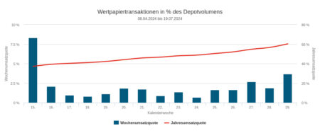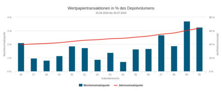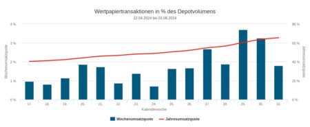 Die Umsatzquote lag nach vier deutlich überdurchschnittlichen Wochen mit 1,80 Prozent dieses Mal leicht unter dem Durchschnitt. Insgesamt ergab sich jedoch für den Monat Juli eine überdurchschnittliche Handelsaktivität, die auch höher war als in den Monaten zuvor.