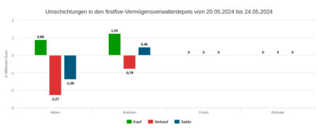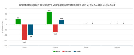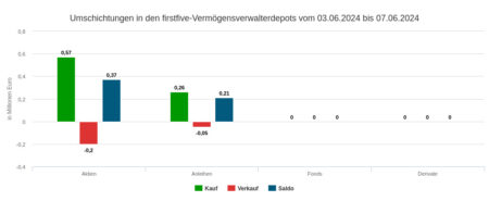 Die Vermögensverwaltungen unseres Depotausschnitts veräußerten in der Woche vom 10. bis 14. Juni 2024 Wertpapiere in Höhe von 0,49 Mio. Euro, davon fielen 0,21 Mio. im Fondssegment, 0,15 Mio. im Renten-Segment und 0,12 Mio. im Aktiensegment an.