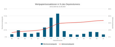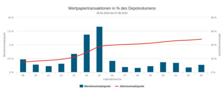 Die Vermögensverwaltungen unseres Depotausschnitts veräußerten in der Woche vom 10. bis 14. Juni 2024 Wertpapiere in Höhe von 0,49 Mio. Euro, davon fielen 0,21 Mio. im Fondssegment, 0,15 Mio. im Renten-Segment und 0,12 Mio. im Aktiensegment an.