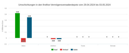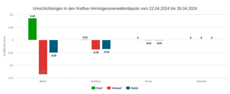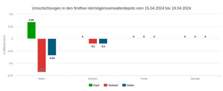 Die per Depotausschnitt erfassten Vermögensverwaltungen setzten mit ihren Veräußerungen in der Berichtswoche Nr. 19 mit 0,49 Mio. Euro geringfügig mehr um als mit ihren Käufen (siehe dort). Dieser Umsatz verteilte sich auf Anleihen (0,40 Mio. Euro), Aktien (0,08 Mio.) und Fonds (0,01 Mio.).