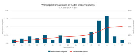 Die per Depotausschnitt erfassten Vermögensverwaltungen setzten mit ihren Veräußerungen in der Berichtswoche Nr. 19 mit 0,49 Mio. Euro geringfügig mehr um als mit ihren Käufen (siehe dort). Dieser Umsatz verteilte sich auf Anleihen (0,40 Mio. Euro), Aktien (0,08 Mio.) und Fonds (0,01 Mio.).