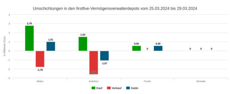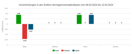 Die Umsatzquote in der 16. Berichtswoche vom 15. bis 19. April 2024 betrug im für den Newsletter selektierten Depotausschnitt 2,09 Prozent. Damit lag sie zwar deutlich unter den Werten der Vorwochen, aber immerhin noch im Bereich des langfristigen Durchschnitts. Die seit Jahresbeginn kumulierte Quote stand Ende der Berichtswoche bei 39,34 Prozent, im Vorjahr betrug diese Quote nach Woche 16 lediglich 28,03 Prozent. Dieser Vorsprung ist auf den Handel in den letzten drei Wochen zurückzuführen. Unser Depotausschnitt hat ein Volumen von 53,62 Mio. Euro, die darin erfassten Vermögensverwaltungen setzten in der Berichtswoche 1,12 Mio. Euro um.