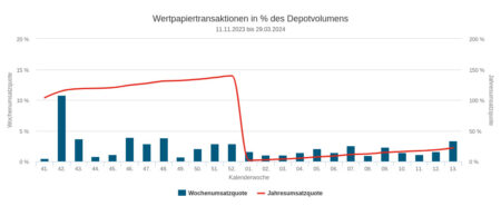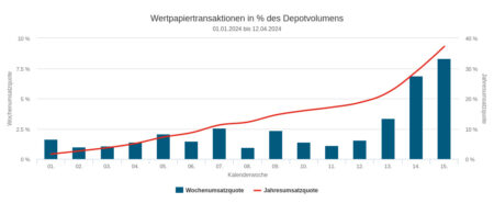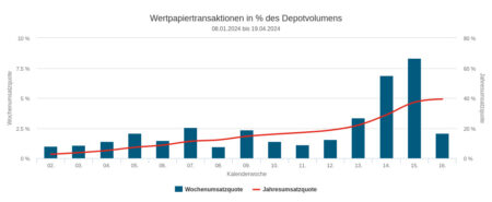 Die Umsatzquote in der 16. Berichtswoche vom 15. bis 19. April 2024 betrug im für den Newsletter selektierten Depotausschnitt 2,09 Prozent. Damit lag sie zwar deutlich unter den Werten der Vorwochen, aber immerhin noch im Bereich des langfristigen Durchschnitts. Die seit Jahresbeginn kumulierte Quote stand Ende der Berichtswoche bei 39,34 Prozent, im Vorjahr betrug diese Quote nach Woche 16 lediglich 28,03 Prozent. Dieser Vorsprung ist auf den Handel in den letzten drei Wochen zurückzuführen. Unser Depotausschnitt hat ein Volumen von 53,62 Mio. Euro, die darin erfassten Vermögensverwaltungen setzten in der Berichtswoche 1,12 Mio. Euro um.