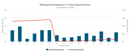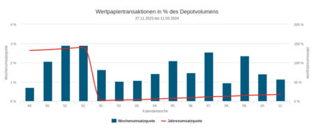 Der Umsatz in der hier zu besprechenden 11. Berichtswoche war zwar verschieden im Vergleich mit dem in der 10. Berichtswoche. Dennoch bestand zwischen beiden Quoten ein enges Verhältnis: sie bauten auf den gleichen Ziffern auf, und die waren vor dem Komma gleich. Aber hinter dem Komma war es wie bei einem Zahlendreher: in der Berichtswoche betrug die Umsatzquote deutlich unterdurchschnittliche 1,14 Prozent, in der Woche zuvor waren es noch 1,41 Prozent. Der seit Jahresbeginn kumulierte Quoten-Wert stand Ende der Berichtswoche bei 17,14%. Der Wochenumsatz belief sich auf 0,62 Mio. Euro.