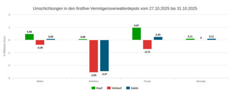 Die Vermögensverwaltungen unseres Depotausschnitt investierten in der Berichtswoche Nr. 45 insgesamt 0,28 Mio. Euro in Wertpapiere, davon waren – korrekt gerundet – 0,21 Mio. für Aktien und 0,08 Mio. für Anleihen.