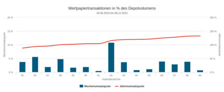 Der relative Umsatz in Berichtswoche Nr. 49 war deutlich geringer als in der sehr aktiven Vorwoche und lag mit 0,71 Prozent auch weit unter dem langfristigen Durchschnitt, der bei ungefähr 2 Prozent liegt. Die seit Jahresbeginn kumulierte Quote lag Ende der Berichtswoche bei 131,76 Prozent. Damit ist sie beinahe gleichauf mit der Quote Ende der 49ten Woche im Vorjahr. Denn diese lag bei 131,99 Prozent.