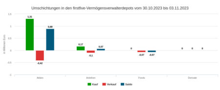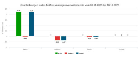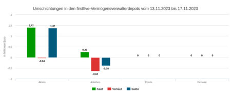 Im Zeitraum vom 20. bis 24. November erzielten die Vermögensverwalter unseres Depot-Ausschnitts einen Verkaufsumsatz in Höhe von 0,94 Mio. Euro. Dieser Umsatz verteilte sich auf Anleihen (0,61 Mio.) und Aktien (0,60 Mio.).