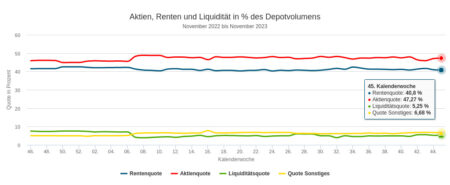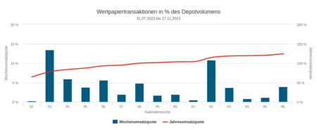 Im Zeitraum vom 20. bis 24. November erzielten die Vermögensverwalter unseres Depot-Ausschnitts einen Verkaufsumsatz in Höhe von 0,94 Mio. Euro. Dieser Umsatz verteilte sich auf Anleihen (0,61 Mio.) und Aktien (0,60 Mio.).