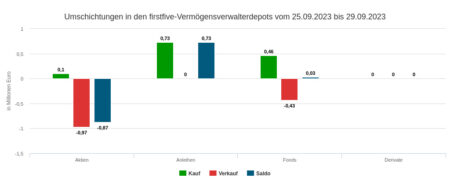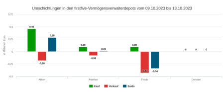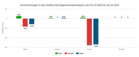 Die Vermögensverwaltungen unseres Depotausschnitts veräußerten in Woche 42 Wertpapiere mit einem Volumen von 12,10 Mio. Euro. Davon entfielen 12,00 Mio. Euro auf Aktien und 0,10 auf Anleihen.