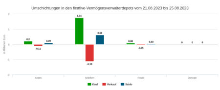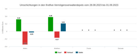 Das Kaufvolumen in der Berichtswoche vom 28.8. bis 1.9.2023 in Höhe von 0,70 Mio. Euro verteilte sich auf Aktien (0,67 Mio.) und Anleihen (0,54 Mio.) und auf nur wenige Wertpapiere.