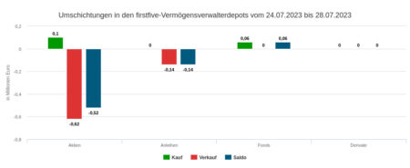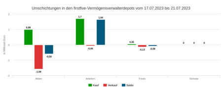 Die Verkäufe in der Berichtswoche summierten sich auf 0,14 Mio. Euro. Davon setzten die erfassten Vermögensverwaltungen durch Aktienverkäufe über 0,12 Mio. Euro um und durch Fondsanteils-Veräußerungen nicht ganz 0,02 Mio. Euro.