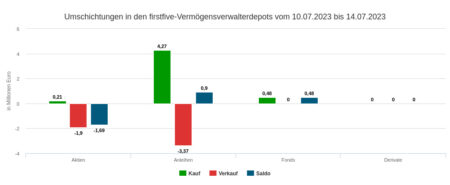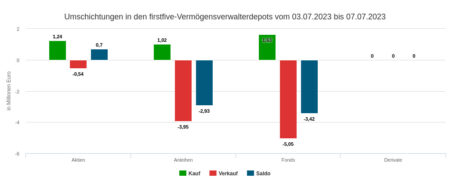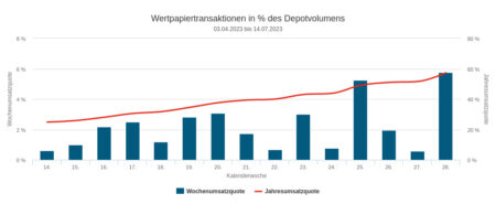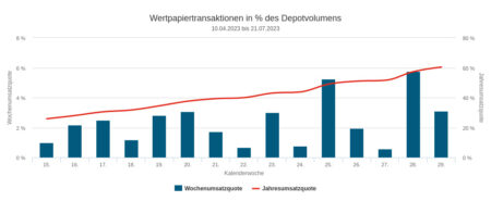 Der Umsatz in der Berichtswoche war sowohl relativ wie absolut über dem Mittelwert der letzten Monate. Mit einem Anteil von 3,09 Prozent des per Ausschnitt berücksichtigen Depotvolumens befand sich die Umsatzquote – wie in der Vorwoche – deutlich über dem langfristigen Durchschnitt. Die seit Jahresbeginn kumulierte Quote kletterte damit auf über 60 Prozent, genau auf 60,43 Prozent. Die Assets under Management, die unser Depotausschnitt für den Newsletter abdeckt, betrugen in der 29. Woche 146,14 Mio. Euro. Der Umsatz in der Woche vom 17. bis 21. Juli lag bei 4,51 Mio. Euro.