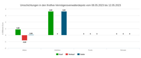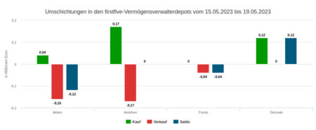 Die Verkäufe in unserem Depotausschnitt der Woche 22 summierten sich auf 0,37 Mio. Euro. Dieses Volumen verteilte sich auf Anleihen (0,20 Mio. Euro), Derivate (0,11 Mio.), Aktien (0,05 Mio.) und Fonds (0,01 Mio.). Auf die drei in unserer Topverkäufe-Liste erstplatzierten Wertpapiere entfiel der größte Anteil des Verkaufsvolumens in der Berichtswoche. Da auf unserer Liste jedoch eine erhebliche Zahl von Verkäufen steht – es waren mehr Transaktionen als auf der Kaufseite –, bedeutet dies, dass die meisten Verkaufstransaktionen außergewöhnlich geringe Beträge hatten.