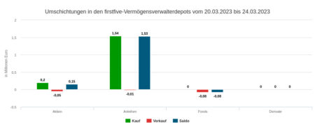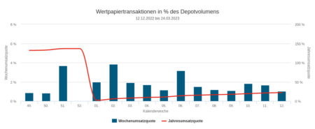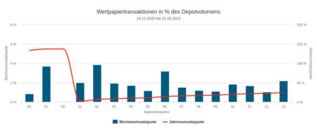 Die Vermögensverwaltungen in unserem für den Newsletter aufbereiteten Depotausschnitt zeigten in der letzten Woche des ersten Quartals eine mittlere Handelsaktivität. Mit 2,18 Prozent des erfasste Depotvolumens lag nämlich die Umsatzquote im langfristigen Durchschnittsbereich.