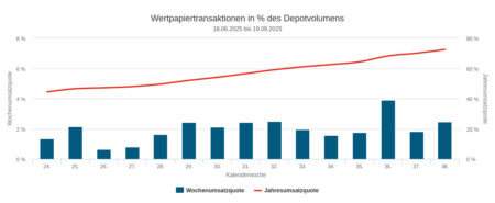 In der 40ten Berichtswoche vom 29. September bis 3. Oktober 2025 war die Umsatzquote in unserem Depotausschnitt trotz des arbeitsfreien „Tages der deutschen Einheit“ mit 3,38 Prozent weit über dem langfristigen Durchschnitt von um die 2 Prozent. Die seit Jahresbeginn kumulierte Quote überstieg Ende der Berichtswoche, d.h. am Donnerstag, die 80er-Marke (80,61%) und ist damit ein wenig höher als in Woche 40/2024.