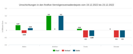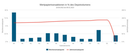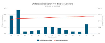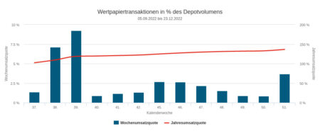 in einem kleinen Handelsausschnitt, den wir unserem Newsletter zugrunde legen. Denn das hier zu kommentierende Depotvolumen für den Zeitraum vom 19. bis 23. Dezember 2022 ist mit 11,9 Mio. Euro nochmals deutlich geringer als das bereits sehr geringe Volumen in der Vorwoche (40 Mio.) und Vorvorwoche (28 Mio.).