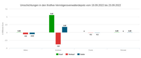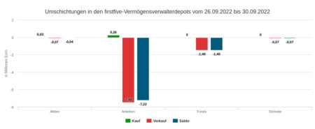 In der 40. Woche betrug der Verkaufsumsatz 0,11 Mio. Euro, die sich auf Anleihen (0,07 Mio. Euro) und Fonds (0,04 Mio.) verteilten.