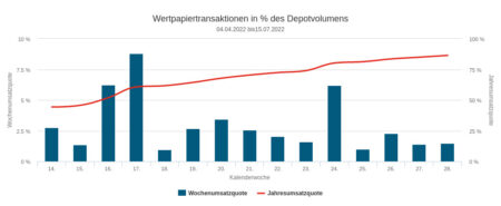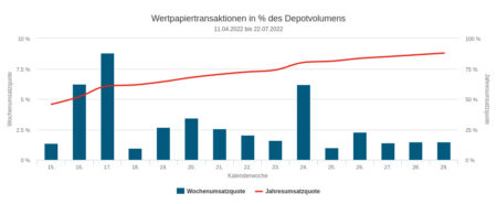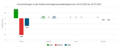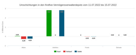 Der Kaufumsatz in Woche Nr. 30 in Höhe von 7,82 Mio. Euro verteilte sich auf Aktien (4,82 Mio. Euro), Anleihen (2,80 Mio.) und Fonds (0,20 Mio.). Damit setzt sich die Kaufliste weiterhin überwiegend aus Einzeltiteln zusammen – wenn auch in der Berichtswoche wenige Fonds darunter sind, was in der Vorwoche nicht der Fall war.
