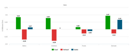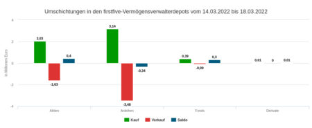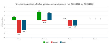 Der Umsatz in der Woche vom 21.03. bis 25.03.2022 in Höhe von 7,12 Mio. Euro verteilte sich auf Aktien (3,62 Mio. Euro), Anleihen (0,21 Mio.) und Fonds (1,39 Mio.). Einen Kaufüberhang beobachteten wir bei Anleihen, einen Verkaufsüberhang jeweils bei Aktien und Fonds. Insgesamt stellte sich im Wochenhandel im Rahmen des erfassten Depotausschnitts ein deutlicher Verkaufsüberhang ein: