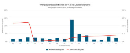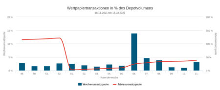 Der Umsatz in der Woche vom 21.03. bis 25.03.2022 in Höhe von 7,12 Mio. Euro verteilte sich auf Aktien (3,62 Mio. Euro), Anleihen (0,21 Mio.) und Fonds (1,39 Mio.). Einen Kaufüberhang beobachteten wir bei Anleihen, einen Verkaufsüberhang jeweils bei Aktien und Fonds. Insgesamt stellte sich im Wochenhandel im Rahmen des erfassten Depotausschnitts ein deutlicher Verkaufsüberhang ein: