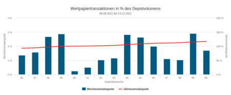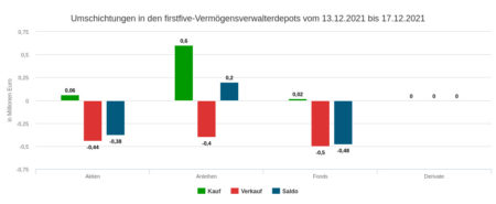 In den beiden letzten Wochen des Jahres 2021 zusammengenommen betrug der Umsatz 2,43 Mio. Euro. Davon entfielen 2,07 Mio. Euro auf Aktien, 0,32 Mio. auf Anleihen und 0,05 Mio. auf Fonds.