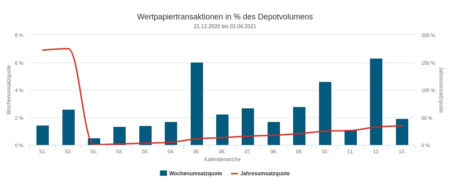 Das Umsatzvolumen in der 13. Berichtswoche in Höhe von 0,68 Mio. verteilte sich auf Aktien-Einzeltitel (0,49 Mio. Euro), Fonds (0,16) und Derivate (0,02). Die Verkäufe überragten mit einem Volumen von 0,38 Mio. Euro die Käufe in Höhe von 0,30 Mio. moderat, wobei wir bei Aktien einen Verkaufsüberhang, bei Fonds und Derivaten einen Kaufüberhang sahen. In der 13. Woche war die Anzahl der Transaktionen im Aktiensegment relativ hoch im Verhältnis zum Volumen.