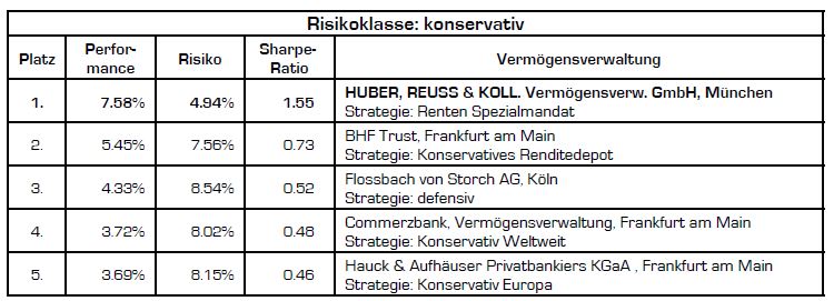 Trotz eines versöhnlichen Jahresabschlusses des DAX konnten die Vorjahreszahlen überwiegend nicht erreicht werden. Dieses gilt insbesondere für die konservative Risikoklasse in der per 31.12.2014 noch zweistellige Spitzenergebnisse zu verzeichnen waren. Der Top-Performer erreichte nur noch 7,5% und auch im Durchschnitt blieben die Ergebnisse per 31.12.2015 mit 1,6% gegenüber 5,5% deutlich unter Vorjahresniveau.