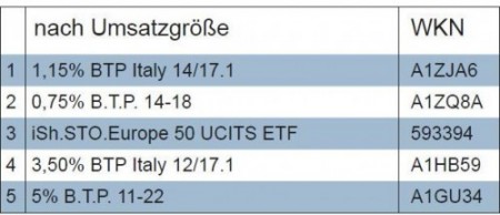In der Liste der relativ größten Käufe (gemessen am Depotvolumen), oft werden damit kleinere nicht so weit durchmischte Depots adressiert, sind es immerhin zwei Anleihen, die es unter die ersten Fünf gebracht haben. In beiden Ranglisten findet man ein Papier des italienischen Staates, das im Mai 2017 die Rückzahlung von je 100 Euro verspricht und jährlich 1,15 Euro an Zins auszahlt. Beim gegenwärtigen Kurs von knapp über Pari errechnet sich eine jährliche Rendite auf Endfälligkeit von 1,1 Prozent. Wir hatten dieses Papier bereits weiter oben erwähnt. Gemessen an der Restlaufzeit beläuft sich der Spread zu einer vergleichbaren Bundesanleihe mittlerweile auf mehr als 130 Punkte (Bundesanleihen mit zweijähriger Restlaufzeit rentieren aktuell mit -0,25 Prozent).