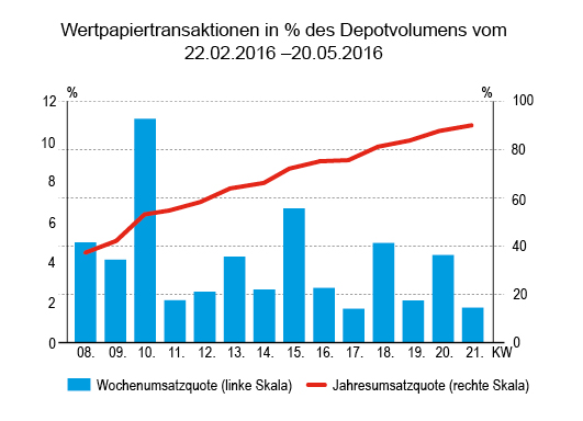 1,75 Prozent des gemeldeten Depotvolumens betrug der Umsatz, das ist schwach, auch im Spiegel des Volumens, denn in der Berichtswoche wurden Werte von insgesamt nicht einmal 9,1 Mio. bewegt.
