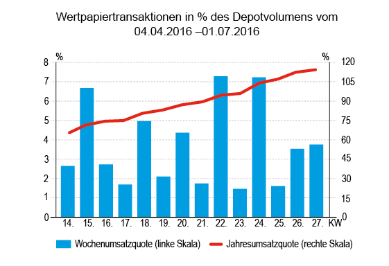 Zwei Entwicklungen fallen bis Ende Juni auf. Zum einen die fast stetige Erhöhung der Rentenquote von 40,84% im Juli 2015 auf 47,73% fast ein Jahr später. Zum anderen der neuerliche Rückgang der naturgemäß etwas stärker und zu den Aktien antizyklisch schwankenden Liquiditätsquote auf unter 7%; entsprechende Werte wurden letztmals im April 2015 erreicht. Offenbar ging dies in letzter Zeit mehr zugunsten der Anleihen als der Aktien. Im gesamten soeben angesprochenen Zeitraum lagen die Sonstigen relativ konstant bei um die 14 bis 15 Prozent. Hat der Glaube an das Potential der Aktienkurse also „strukturell“ gelitten?