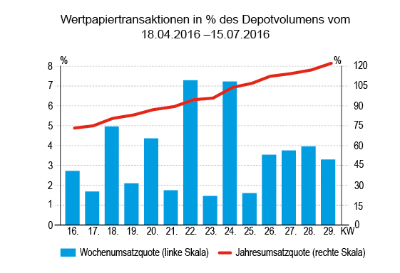 In der Berichtswoche wurden 3,30% des gemeldeten Depotvolumens umgesetzt – ein durchschnittlicher Wert. Allerdings lag das Gesamtvolumen der uns gemeldeten Depots nur bei rund 240 Mio. Euro, das ist weniger als ein Drittel des in der Vorwoche gemeldeten Betrags. Daher war auch der Gesamtumsatz mit 8,02 Mio. Euro unterdurchschnittlich. Den uns übermittelten Daten entnehmen wir, dass einige Verwaltungen mit relativ großen und konservativ ausgerichteten Depots fehlten. Das mag mit erklären, weshalb der Umsatz bei Anleihen weit unterdurchschnittlich war.