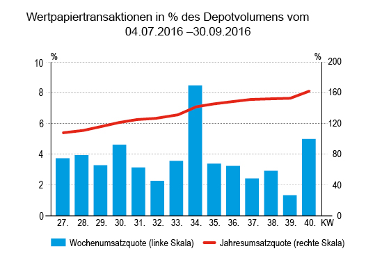 Mit einem Anteil von 5,01 Prozent des gemeldeten Depotvolumens lag die Handelsaktivität nach zwei mäßigen Wochen und drei „Flautewochen“ wieder einmal über dem langfristigen Durchschnitt. Insgesamt wurden in der Berichtswoche rund 31 Mio. Euro umgesetzt. Davon entfielen auf Käufe knapp 13 Mio. Euro und auf Verkäufe rund 18 Mio. Euro. Der Verkaufsüberhang ist ein möglicher Hinweis auf Gewinnrealisierung. Der Gesamtgewinn der Verkäufe von 1,4 Mio. Euro nach Abzug der Verluste spricht für diese Vermutung.