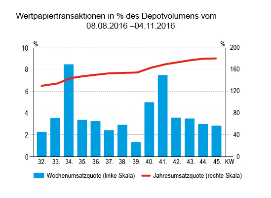 Die Umsatzquote war in der Woche vom 31.10. bis 4.11.2016 mit 2,85 Prozent des gemeldeten Depotvolumens noch geringer als in der Woche zuvor (2,99). Jedoch übermittelten uns dieses Mal mehr Vermögensverwaltungen ihre Daten für die hier zu besprechende Berichtswoche. Daher lag das insgesamt gemeldete Depotvolumen im höheren Durchschnittsbereich, und der absolute Umsatz war mit 17,56 Mio. Euro höher als in der Vorwoche. Der Verkaufsumsatz lag mit 9,93 Mio. Euro deutlich über dem Kaufvolumen von 7,63 Mio. Euro.