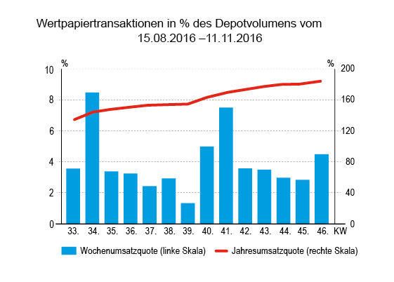 Die Umsatzquote in der Berichtswoche vom 7.11. bis 11.11. 2016 lag mit 4,51 Prozent über dem langfristigen Durchschnitt. Bemerkenswerter ist jedoch, dass das gemeldete Depotvolumen, auf das sich die Umsatzquote bezieht, deutlich höher war als sonst. Es lag in der Berichtswoche nur knapp unter einer Milliarde Euro. Dementsprechend war das Umsatzvolumen mit 42,81 Mio. Euro so hoch wie selten. Insgesamt wurden uns 227 Transaktionen während der Berichtswoche gemeldet, davon waren 103 Käufe und 124 Verkäufe.