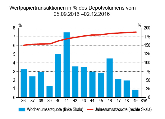 Nur 0,89 Prozent des gemeldeten Depotvolumens oder, in absoluten Zahlen ausgedrückt, Papiere im Gesamtwert von knapp über 5 Mio. Euro wurden in der Berichtswoche vom 28.11. bis 2.12. gehandelt. Das ist Jahres-Minusrekord und zudem das erste Mal im Jahr 2016, dass die 1-Prozent-Schwelle unterschritten wurde. Möglicherweise haben zu diesem schwachen Handel die in der Berichtswoche noch bevorstehenden Wahlen in Österreich und Italien beigetragen. Dann hätten die Verwaltungen, trotz der Coolness der Märkte, lieber abgewartet, wie die politischen Entscheidungen der Wähler ausfallen würden.