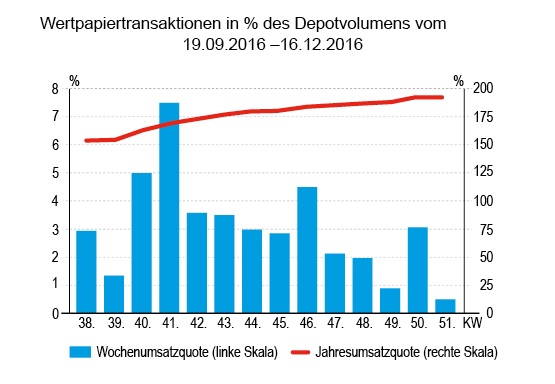 Bei minimalen Umsätzen von gerade mal 0,49 Prozent der gemeldeten Depots (und die machen auch nur etwa 300 Millionen Euro an Gesamtvolumen aus) blieb zum Jahresende (fast) alles still. Anleihen wurden mit rund einer Million Euro noch am meisten gehandelt, danach folgten Fonds und Aktien. Bei Derivaten blieb es ganz und gar unbewegt.