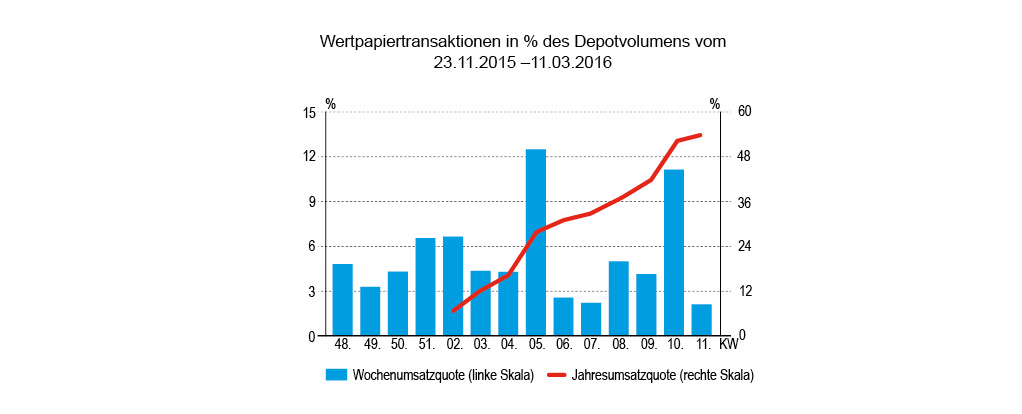 Gebremst gilt für zwei Aspekte. Erstens war der relative Umsatz mit 2,11 Prozent des gemeldeten Depotvolumens sehr verhalten. In den drei Wochen zuvor lag dieser Umsatzwert im oberen Durchschnitt oder darüber. Aber den Wechsel von mehrwöchiger relativer Aktivität und (einwöchiger) Zurückhaltung beobachteten wir bereits im Januar dieses Jahres. Die zweite „Bremsspur“ in unseren Datensätzen ist der Umstand, dass die Woche von defensiven Investments bestimmt war: Anleihen, Anleihen und nochmals Anleihen, nur wenige Aktien und gerade einmal ein Fonds auf der Kaufseite.