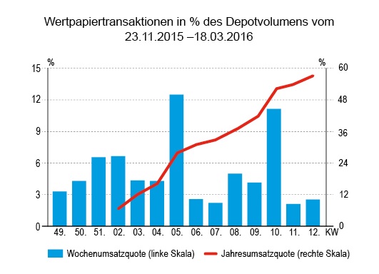 Das Transaktionsvolumen an Anleihen, der dominanten Anlageklasse der vergangenen Wochen, macht heuer nur 3,6 Millionen Euro aus. Mit einem durchschnittlichen Depotanteil von über 46 Prozent ist aber auch so etwas wie eine Sättigungsgrenze erreicht.