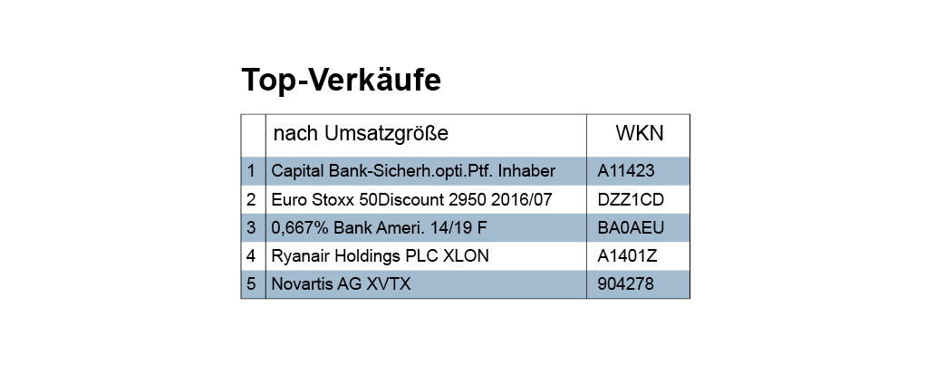 Der Verkaufsumsatz der Berichtswoche wurde angeführt von Festverzinslichen (6,87 Mio. Euro), gefolgt von Aktien (5,04), Derivaten (1,74) und Fonds (0,29). Bei Obligationen wurden fast nur Papiere europäischer Unternehmen abgegeben. Hier wurden vielfach Kursverluste hingenommen, weshalb die Gewinn-Verlust-Bilanz insgesamt negativ ausfiel. Das war aber auch bei Fonds und Zertifikaten nicht anders. Nur knapp positiv gestaltete sich die Bilanz im Aktiensektor. Dort beobachteten wir in der Berichtswoche