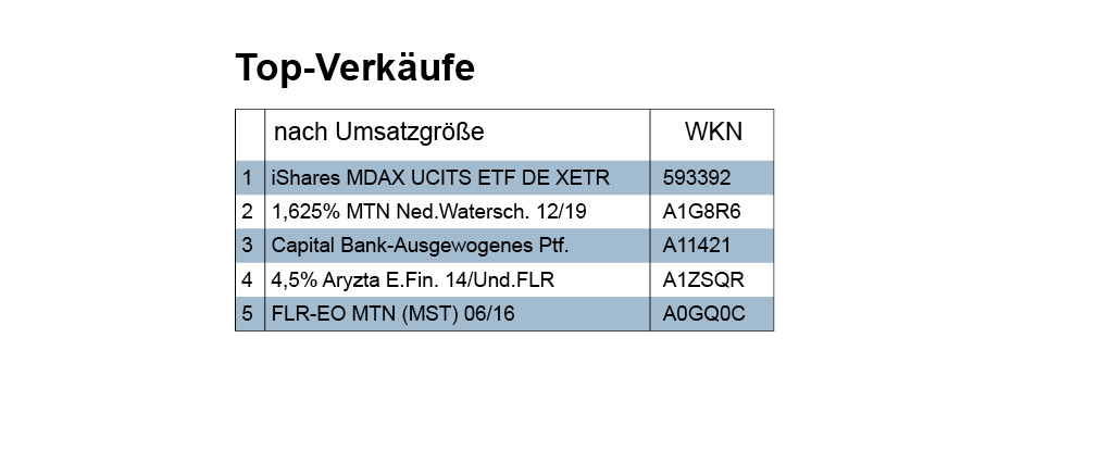 Mehr Abwechslung in Bezug auf die Produktklassen als die Käufe bieten die Verkäufe, besonders wenn man die Top Ten der beiden Verkaufsrankings betrachtet. Der im Kaufranking gemäß Transaktionssumme drittplatzierte Mischfonds (A11421) ist in den großen Fondsplattformen nicht verzeichnet. Aber die Suchmaschinen sind heutzutage so raffiniert programmiert, dass Verstecken sinnlos ist. Schon nach kurzer Recherche findet sich doch ein Produktinformationsblättchen über den als ausgewogen beworbenen Fonds. Man erfährt daraus, dass „Aktien mit bis zu 50 v.H. des Fondsvermögens begrenzt sind“, dass man auch in Anleihen (max. 75%), in Wandel- und Optionsanleihen (bis zu 20 v.H.), in Rohstoff- und Rohstoffindexzertifikate (bis zu 10 v.H) und in Geldmarktpapiere, in Anteile an anderen Investmentfonds und in Sichteinlagen (jeweils bis zu 100 v.H.) investiert. Möglicherweise zu viel der Mischung, die aktiv gemanagt werden möchte, denn die laufenden Kosten sind mit 1,55% doch relativ hoch. Ob der Fonds seinen Preis wert ist, wird die Zukunft zeigen müssen. Denn er wurde erst 2014 aufgelegt.