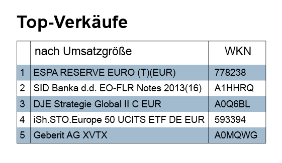 Verkauft wurden in der Karwoche größtenteils nur Fondsanteile für knapp über 3 Mio. Euro. Und ein strukturiertes Produkt, das zurückgezahlt wurde, trug mit weiteren 3 Mio. Euro ebenfalls zum Verkaufsumsatz bei. Der Beitrag zum Verkaufsvolumen von Aktien und Anleihen war hingegen verschwindend. In der zweiten Hälfte unserer Doppelwoche nach Ostern waren bei den Abgaben gleichfalls Fonds mit 5 Mio. Euro ganz vorne. Dabei schnitten Aktien mit 1,7 Mio. und Anleihen mit 1,24 Mio. Euro besser ab als noch in der Karwoche zuvor.