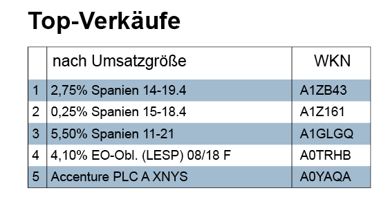 Das Verkaufsvolumen von 13,4 Mio. Euro splittete sich auf in 12,24 Mio. Euro, die im Rentensegment anfielen, 0,76 Mio. bei Aktien, 0,39 Mio. bei Fonds sowie 0,01 Mio. Euro bei Derivaten. Ganz oben auf der Liste der Top-Verkäufe stehen Staatsanleihen Spaniens. Die beiden erstpositionierten Anleihetransaktionen spielten am letzten Tag der Handelswoche bei nun etwas nachgebenden Kursen Gewinne ein, die drittplatzierte Transaktion war ein Verlustgeschäft. Allerdings gehen diese Verkäufe auf nur eine Vermögensverwaltung zurück, die meisten anderen Entscheider hielten sich bei den Festverzinslichen auch verkaufsseitig zurück.