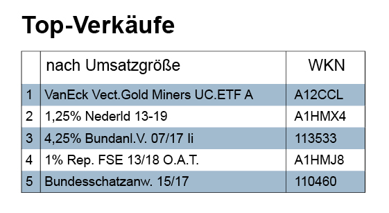 Bei den Verkäufen lagen Anleihen mit einem Umsatz von 2,7 Mio. Euro vor Aktien (0,87 Mio.) und Fonds (0,64 Mio.) ganz vorne im Ranking der Topverkäufe gemäß Volumen steht aber ein ETF auf Gold- und Silberminen.