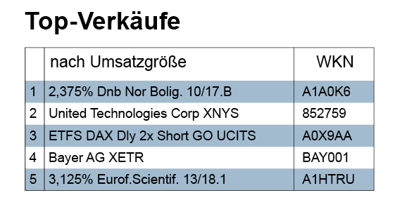 Beim Verkaufsumsatz mit dem geringen Volumen von 2,22 Mio. Euro lagen Anleihen (1,12) vor Aktien (0,82) und Fonds (0,42). Die first five bei den abgegebenen Aktien: United Technologies, Bayer, Syngenta, Zurich Insurance, Atlas Copco.